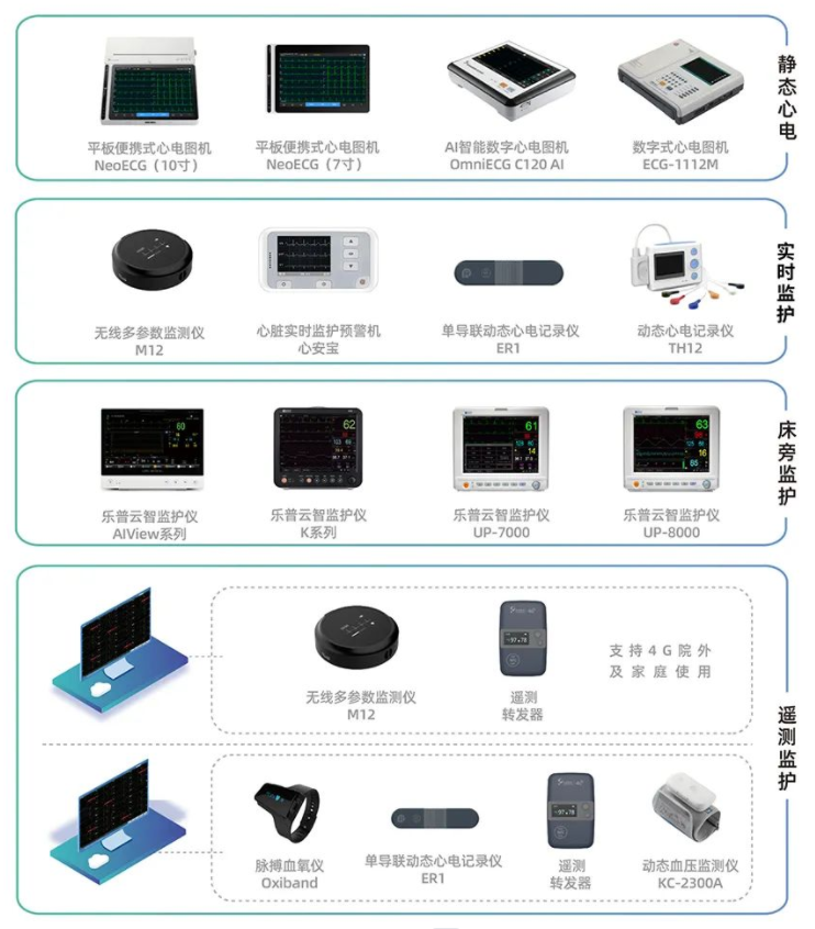 对于长程心电实时预警的用户,在县医院或基层卫生站戴机后,用户心脏数据实时回传至Al-ECG心脏数据中心,并通过乐普心电人工智能技术进行实时的监护。