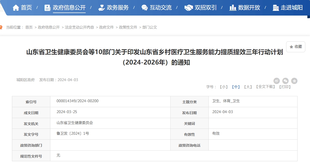 4月初,山东省卫生健康委员会等10部门联合印发《山东省乡村医疗卫生服务能力提质提效三年行动计划(2024-2026年)》(以下简称《行动计划》)。