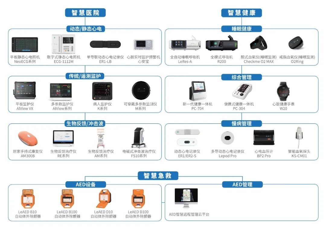 除了智慧健康板块,乐普AI医疗版图还拥有完善的智慧医院产品线和智慧急救产品线,已形成“三位一体”战略布局。其中,智慧健康产品线聚焦慢性病与睡眠呼吸管理,构建居家健康监测网络;智慧医院产品线深度整合院内诊疗场景,以智能化设备提升临床决策效率;智慧急救产品线则通过便携式急救终端与区域急救平台,打通生命救援“最后一公里”。