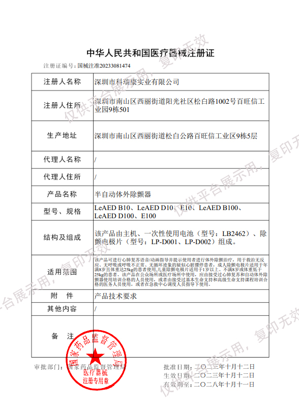 该产品可进行心肺复苏语音/动画指导并提示使用者进行体外除颤治疗,用于救治无反应、无呼吸或呼吸不正常、无循环迹象的疑似心脏骤停患者,成人除颤电极片适用于年满8岁月体重达25kg的患者使用,儿童除颤电极片适用于1岁以上、不满8岁或体重低于25kg的患者。该产品在公众场所或医疗场所中使用,应由接受过心肺复苏和自动体外除颤器使用培训合格的人员使用,或者由接受过基本生命支持和高级生命支持课程培训合格的医务人员使用,或者在急救中心调度人员指导下使用。